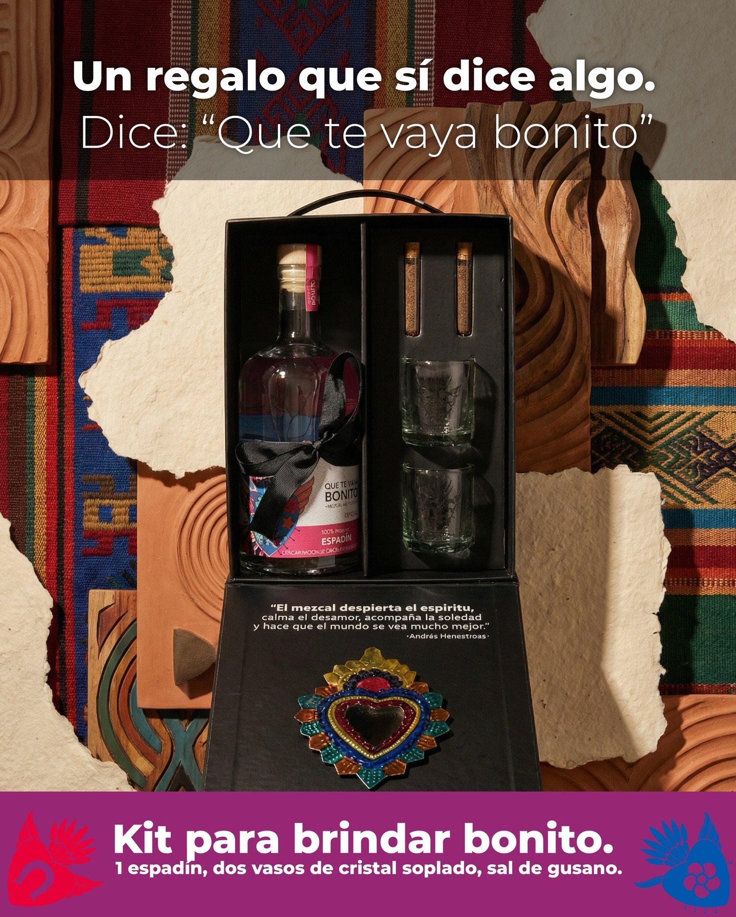 Nuestro kit mezcalero Que Te Vaya Bonito reúne lo esencial del ritual mezcalero en una presentación cuidada y significativa. Cada elemento ha sido seleccionado para honrar la tradición, el diseño artesanal y el buen mezcal. Incluye una botella de Mezcal Espadín de 750 ml, dos vasos de vidrio soplado, sal de gusano y un “milagrito” de latón.